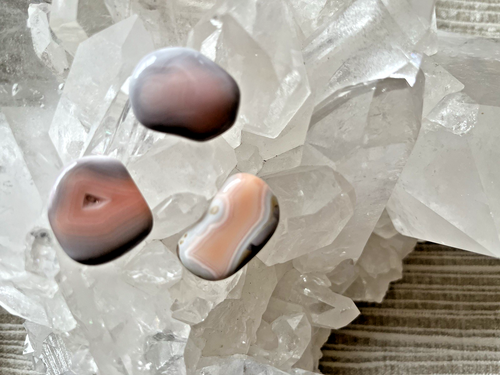 3 Achat-Trommelsteine mit Entzündungssignatur, Größe ca. 3×2 cm, insg. ca. 25 g