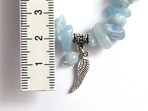 Material: Edelsteinsplitter Aquamarin, Splittergröße ca. 02-04 x 05-10mm, hochwertiger Elastikfaden, Metallanhänger “Engelflügel”, Aquamarinperle 4 mm