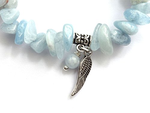 Material: Edelsteinsplitter Aquamarin, Splittergröße ca. 02-04 x 05-10mm, hochwertiger Elastikfaden, Metallanhänger “Engelflügel”, Aquamarinperle 4 mm
